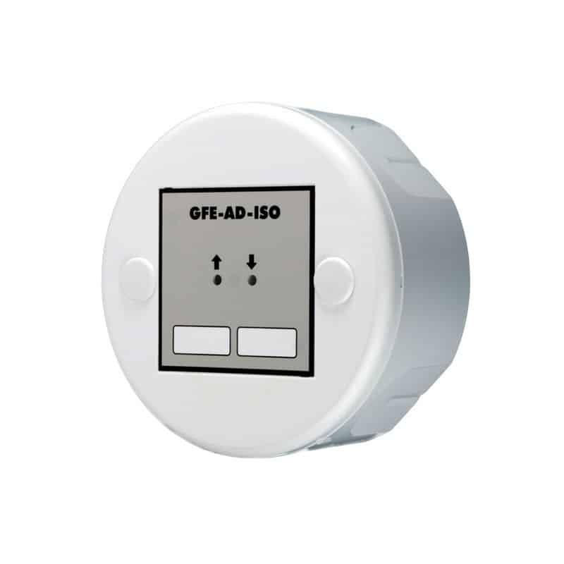 GFE-AD-ISO, kablo girişini kolaylaştıran beyaz yuvarlak bir bağlantı kutusunda sunulmaktadır. Ünite üzerinde bulunan iki Sarı LED çevrimin hangi tarafında (Çevrim Girişi veya Çevrim Çıkışı) kısa devre olduğunu göstermektedir. Bu özellik, etkilenen bölgenin yerinin bulunmasını kolaylaştırır, etkilenen bölgenin yerini bulmak için iki izolatörü izlemeye gerek yoktur. GFE-AD-ISO polariteye duyarlıdır, ters polarite ile bağlanırsa zarar görmektedir. Bağlantı terminallerinde belirtilen polariteye özen gösterilmesi gerekmektedir. Her bir izolatör (EN54} arasına en fazla 32 cihaz bağlanabilmektedir. Normal koşullar altında GFE-AD-ISO her iki yönde 0,3 Ohm gibi düşük bir direnç üretir. Bir kısa devre olduğu zaman izolatör açık devre konumuna geçmekte ve Çevrim “iN” ve Çevrim “OUT” hatlarını ayırmaktadır. İzole edilen bölge her 3 saniyede bir puls ile test edilmekte ve yük direncinin 175 Ohm ‘dan büyük olması durumunda otomatik olarak sisteme yeniden bağlanmaktadır.